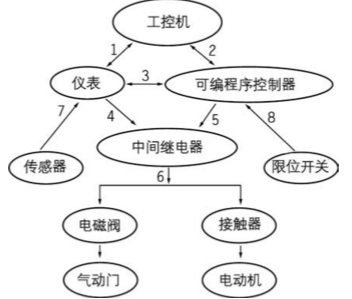 PLC控制系统将控制任务分成三部分,由工控机、智能仪表、PLC各完成其中一部分。工控机主要负责将生产任务下达到PLC以及仪表,配方管理,采集仪表配料数据存储管理,采集PLC状态点动画显示及报警提示,打印报表;智能仪表接受工控机输入的配方数据与PLC发出的启动信号,负责配料控制过程,传感器返回信号直接接入仪表,仪表将模拟信号放大并转换成重量显示;PLC负责控制生产动作全过程,接受工控机发出的启动信号与外部开关量输入的限位开关信号、设备运行信号,经逻辑判断控制仪表运行,控制搅拌时间及搅拌机开门关门等。控制原理框图如下: